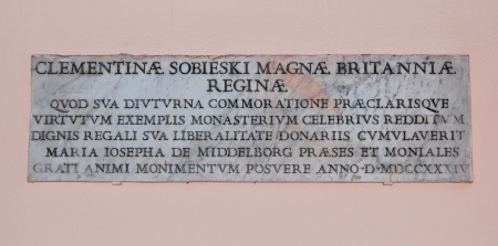[19] ”In the year of our Lord 1734, Mother Superior Maria Giuseppa di Middelborg and the sisters laid a testimony of gratitude in honour of Clementina Sobieski, Queen of England, because with her long stay and glorious examples of virtue she filled the monastery with gifts worthy of her royal generosity, making it more distinguished” (translation by the author). The plaque is now located in a room in the convent of the Province of Italy of the Ursuline Roman Union.