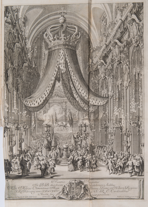 The publication was illustrated with three engravings based on drawings by Roman landscape painter Giovanni Paolo Pannini (1691 or 1692–1765). The title page with the portrait of the queen was made in a copperplate etching by Giovanni Girolamo Frezza (1659–1741). The castrum doloris and the interior of the Basilica dei Santi Apostoli during the private funeral rites and burial were depicted by Baldassare Gabbuggiani (1689–after 1750). The engraving shows the interior of the church with the funeral procession at the catafalque reminiscent of a ceremonial bed. Mourning draperies adorned with ermine fur flow down from the canopy in the shape of a huge crown suspended above it; countless candles burn around it. The temple is filled with people, and on the catafalque, one can makes out the figure of the deceased in a crown and an outstretched ermine cloak, drawn in foreshortened perspective. This is an exceptionally accomplished example of the Baroque theatrum of impressive scale and grandeur, excellent organisation, and richness of style. The funeral decorations were designed by Ferdinando Fuga (1699–1781), an architect who designed sacred buildings and palaces, active in Rome and Naples at the time,.