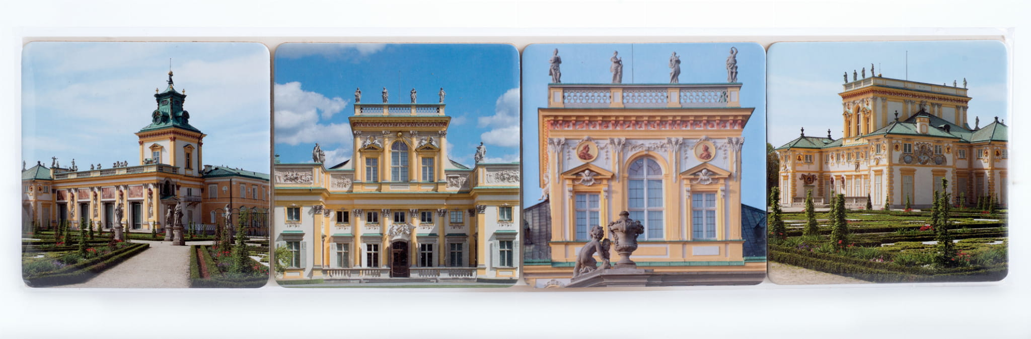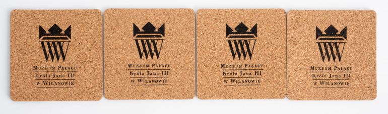 The set includes four cork placemats measuring 9.3 x 9.3 cm with a view of the facade of the Wilanów Palace.
