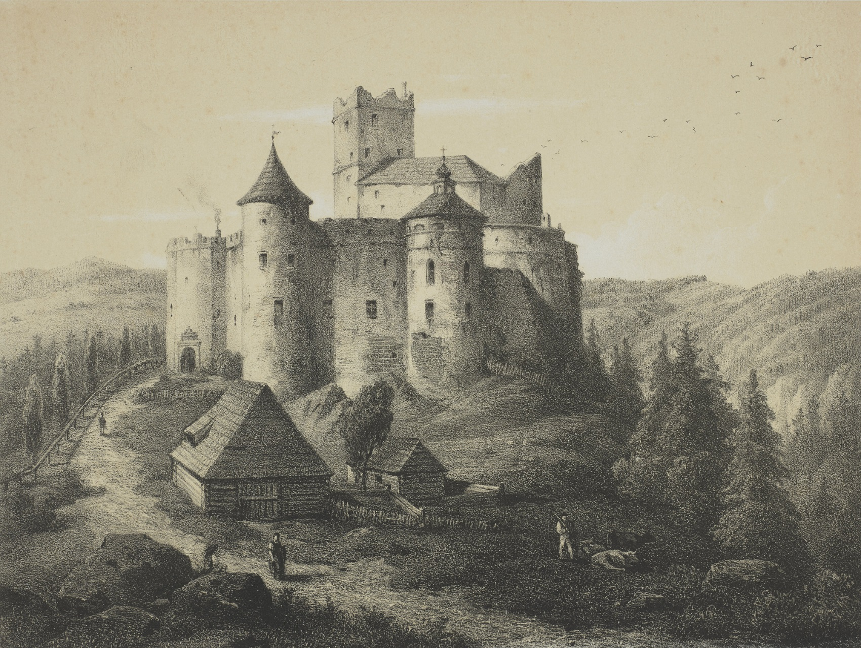 Rycina przedstawia pejzaż z zamkiem. Na pierwszym planie drzewa i krzewy oraz dwójka ludzi z psem. W tle jasny zamek i inne zabudowania, być może kościół oraz domy. Na niebie białe chmury. Jest to zamek Krasiczyn nad rzeką Sanem, rycina Alojzego Misierowicza wg wzoru Napoleona Ordy z 1880 r.