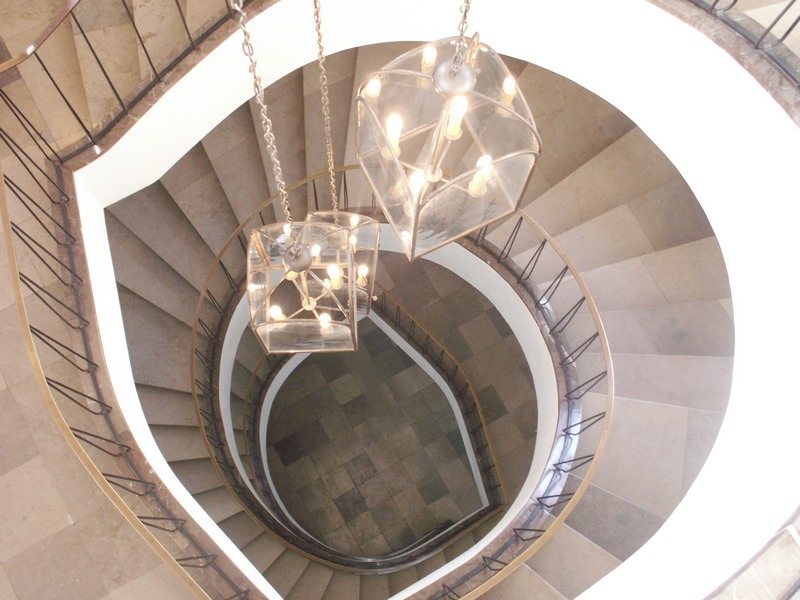 Widok od góry na klatkę schodową. Trzy przezroczyste żyrandole opadają na łańcuchach w dół. Jest to dwudziestowieczna klatka schodowa w wieży południowej.