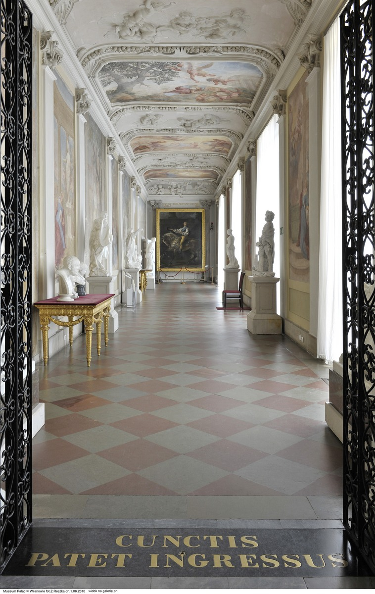 Kolorowe zdjęcie współczesne. Przedstawia korytarz pałacowy i dwukolorową posadzkę z piaskowca w Galerii Południowej w Wilanowie.