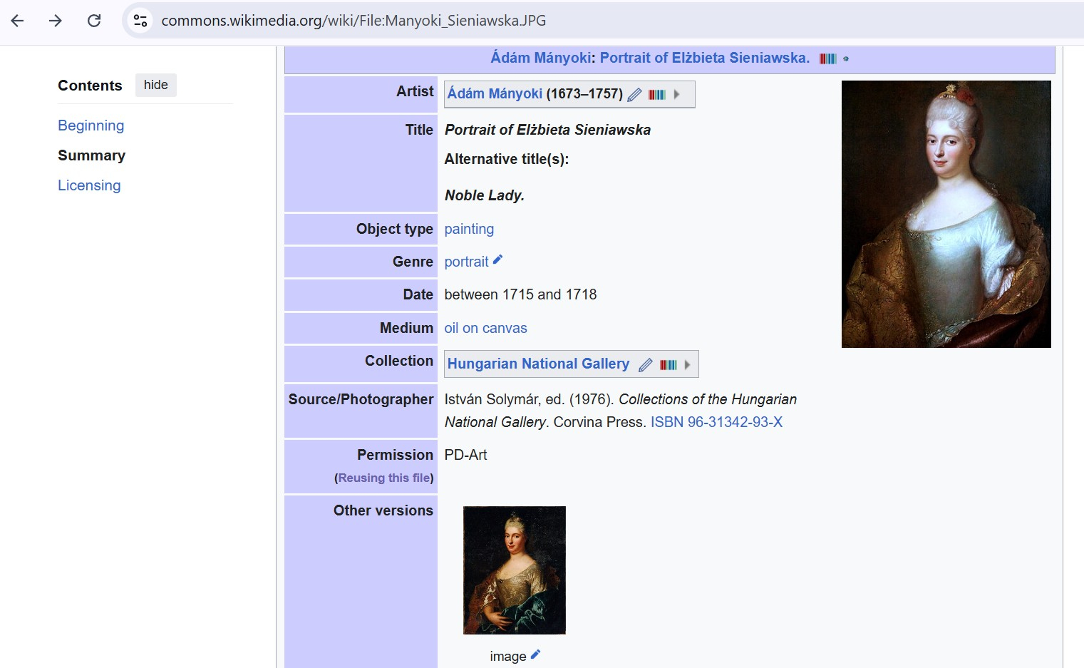 Nie można jednak wykluczyć, że chronologicznie pierwszą próbą identyfikacji kobiety na portrecie Mányokiego jako Sieniawskiej jest wzmianka z polskiej Wikipedii. Użytkownik o nicku BurgererSF umieścił tam w 2010 roku plik z owym dziełem i podpisał je jako „Portret Elżbiety Sieniawskiej”, dodając alternatywny tytuł „Portret damy” („Noble lady”). Jako źródło (niejasne czy informacji czy fotografii) podano katalog budapeszteńskiej galerii z 1976 roku (István Solymár, Collections of the Hungarian National Gallery, Budapest 1976). Problem w tym, że w owej publikacji nic o tym dziele nie napisano – co jest zupełnie zrozumiałe, skoro znalazło się ono w zbiorach Węgierskiej Galerii Narodowej dopiero w 2002 roku.