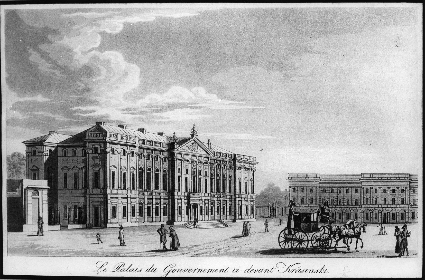 Należący do Krasińskich pałac, mocno nadwerężony po zniszczeniach dokonanych przez wojska saskie, w 1764 r. nabyła Komisja Skarbowa na potrzeby własne i innych urzędów Rzeczypospolitej, przeprowadzając niezbędne adaptacje. Na drugim piętrze umieszczono kancelarie hipoteczne i notarialne oraz mieszkania urzędników skarbowych; tam właśnie w nocy z 15 na 16 grudnia 1782 r. wybuchł groźny pożar. Jak informowano w pisanej gazetce warszawskiej, „jeden z oficjalistów wysłał chłopca po drewka na komin pod dachem złożone. Ten między drwami przez zapomnienie zostawił świecę. Nazajutrz, przypomniawszy sobie o tym, zastał już dobrze tlejące się drwa i zalał ogień, jak mu się zdawało”. Nie do końca, ponieważ o godzinie dziesiątej płonęło już gwałtownie całe piętro; gorzało tym łatwiej, iż pod dachem zgromadzono 30 sążni drewna opałowego, co wykazało późniejsze śledztwo. Ołów płynący z roztopionych blach, którymi dach był pokryty, utrudniał dostęp do budynku. Wprawdzie oknami wyrzucano, co się dało, m. in. liczne sprzęty i owo nieszczęsne drewno, ale tym samym hamowano na dole dostawę wody do gaszenia pożaru. Trwał on trzy dni. W międzyczasie „trzy razy przybiegał Król Jmć [Stanisław August Poniatowski] i do ratowania lud zachęcał”, udzielali się też osobiście królewski bratanek książę Stanisław i pisarz polny koronny Kazimierz Rzewuski. Ten ostatni „sam siekierą robił, dla zachęcenia przynajmniej, i ku najmocniejszemu przedzierał się ogniowi, aż Król sam Jmć wołał na niego, aby się tak śmiało nie azardował”.