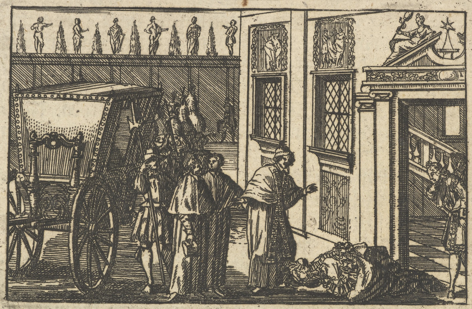 Grafika przedstawia kobietę, która pada na twarz przed grupą mężczyzn. Z lewej strony karoca, obok niej dostojnicy i żołnierze. Jest to rycina pt. „Maria Kazimiera wita papieża Klemensa XI”.