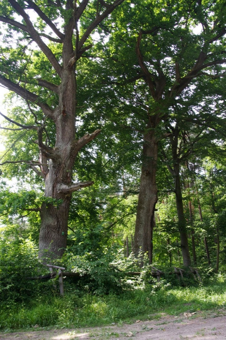 Współczesna fotografia. Przedstawia stare drzewa. Są to dęby Sobieskiego w Sieniawce. W pobliżu osady Sieniawka znajdują się 2 drzewa w wieku ok. 300 lat, co czyni wielce prawdopodobnym, że zasadził je sam Jan Sobieski. W obwodzie pnia dęby mają 345 cm i 365 cm.