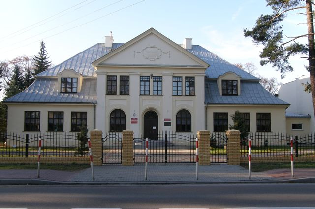 Współczesne zdjęcie. Przedstawia widok na fasadę zabytkowego budynku. Jest to Szkoła Podstawowa im. Króla Jana III Sobieskiego w Puszczy Mariańskiej.