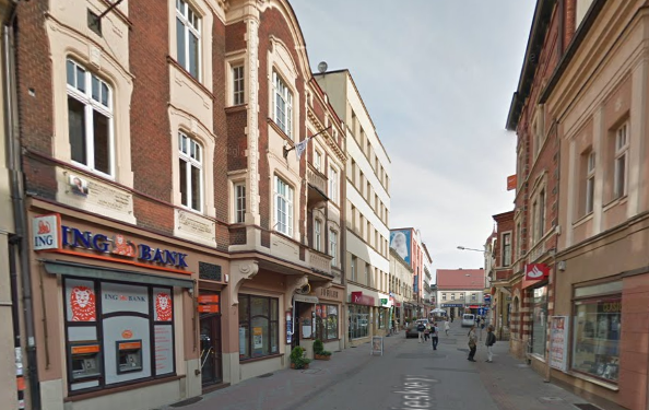 Współczesne zdjęcie. Przedstawia widok ulicy w mieście. Z prawej i lewej strony kamienice. Jest to Ulica Sobieskiego w Rybniku.